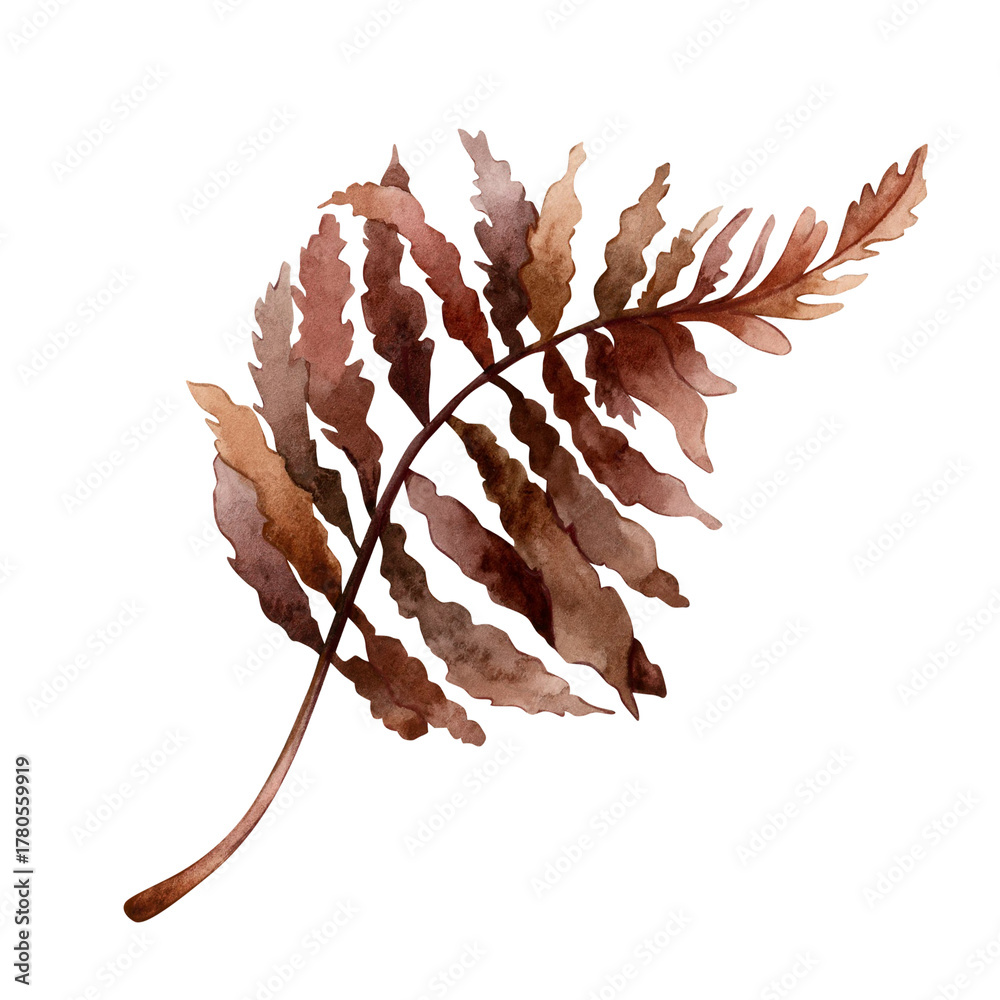 Fern Branch. Dark red brown plant. Watercolor hand drawn floral illustration isolated on white background fall wedding