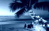 Tropical beach scene at sunset with a palm tree wrapped in glowing Christmas lights and two gift boxes with red ribbons on the sand, creating a festive holiday atmosphere by the ocean.