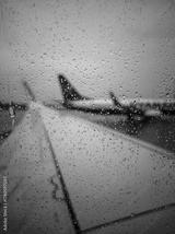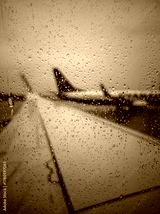 Delayed flight, raindrops on the plane window, bad weather at the airport