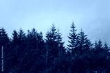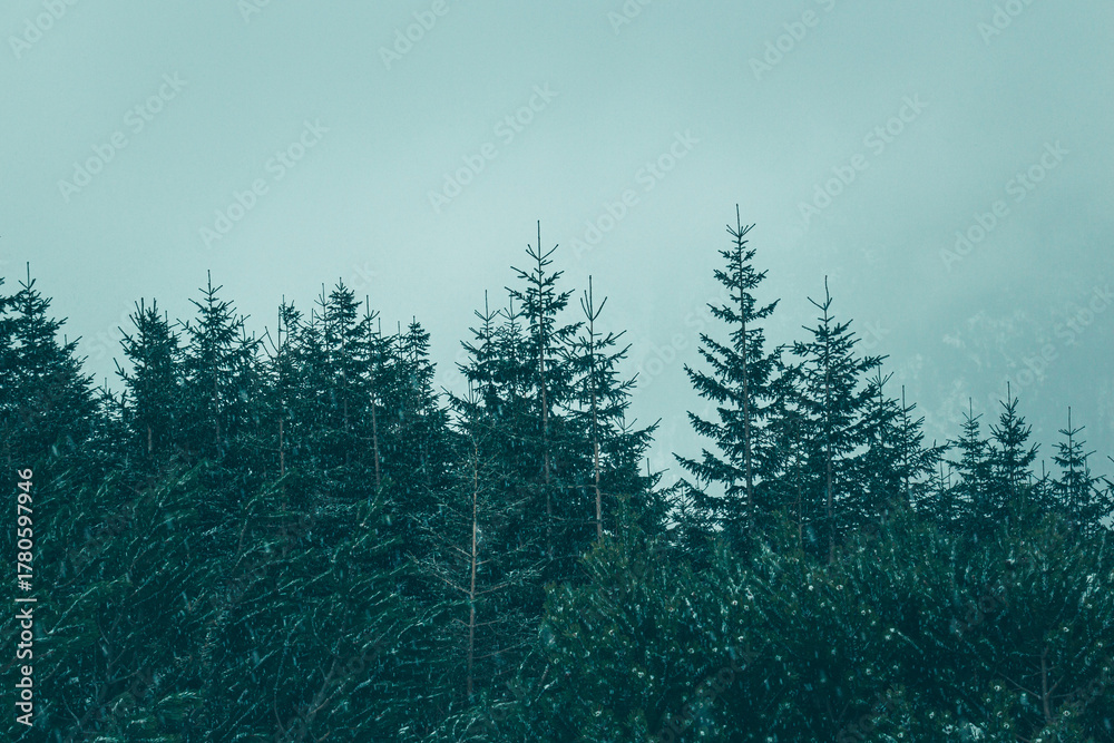 The first snow falls on green spruces in the fog