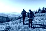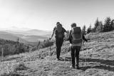 Two old people with large backpacks hike through the autumn mountains, the concept of active recreation in old age