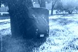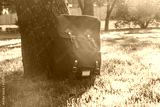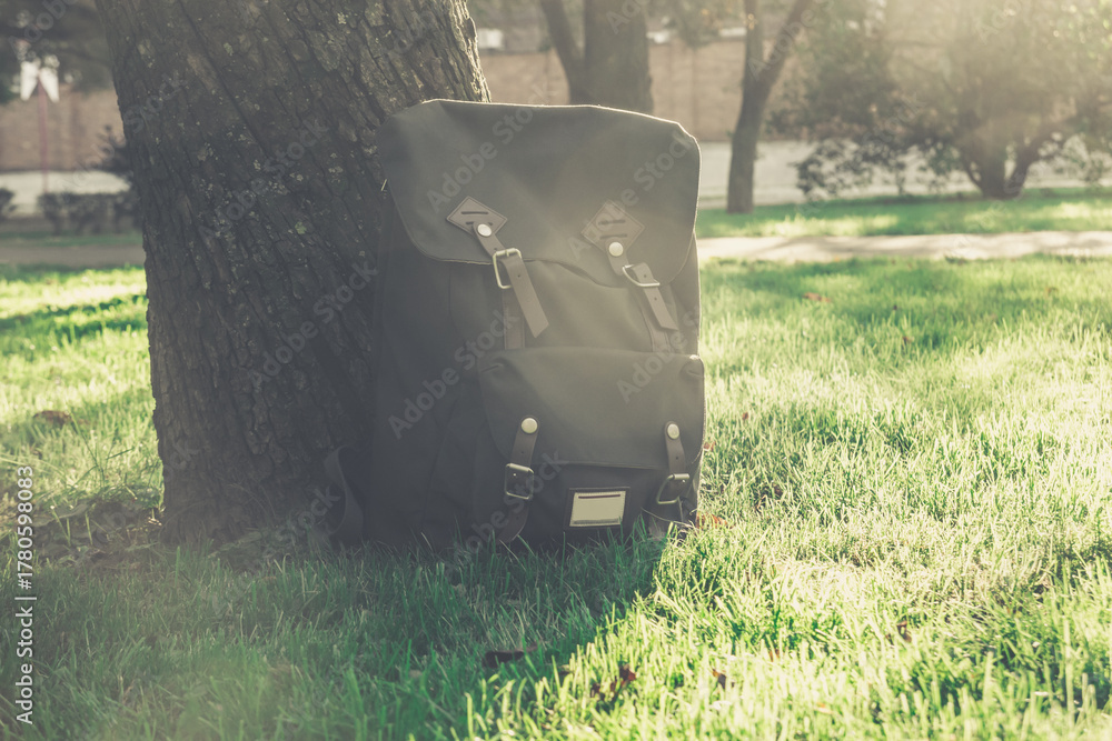 Vintage travel backpack stands on the grass under a tree, retro style toned
