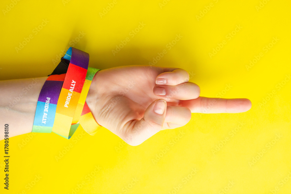 Women's hand wrapped in rainbow ribbon LGBT symbol shows off the middle finger, the concept of confrontation with the traditional world