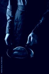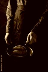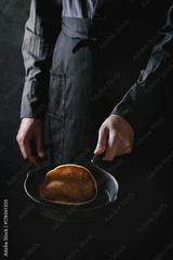 Man chef in black apron cooking pancakes in cast-iron pan. Tossing a pancake in the air. Dark rustic style.