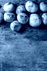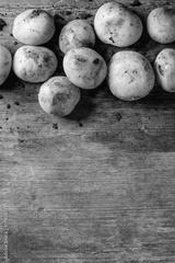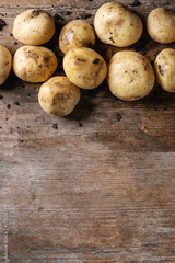 Raw whole organic potatoes with soil over old wooden background. Top view with copy space