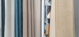 Curtains assortment in the home decor store. New high-quality curtains goods. Fabric store. Interior design. Sale and purchase of curtains and drapes. Curtains assortment. Fabrics of different colors
