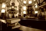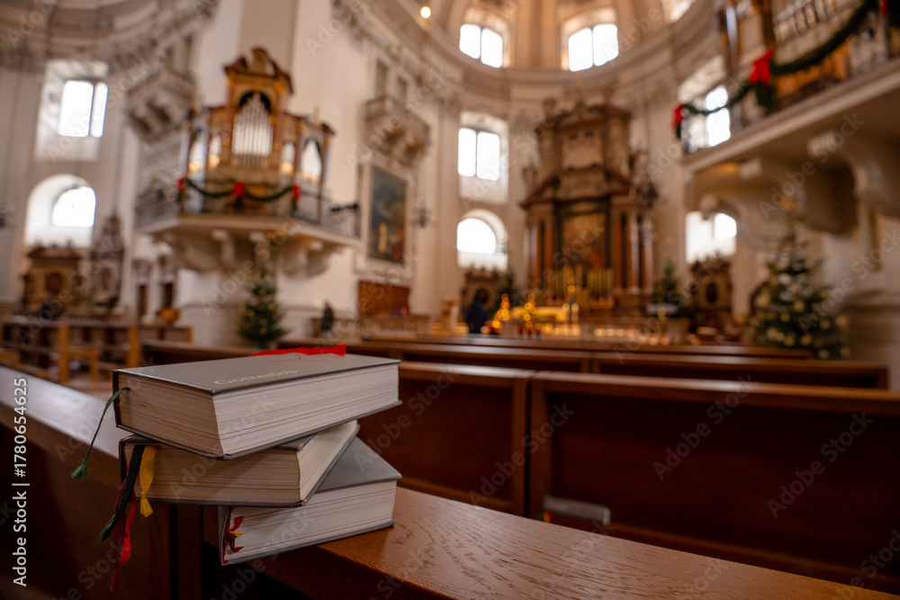 Salzburg, Austria - December 23, 2024: Stack of hymn books on a wooden pew inside a bright baroque church with decorated altar, Christmas trees, and sunlight filtering through tall arched windows.