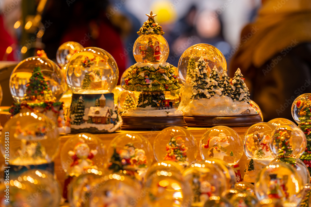 Salzburg, Austria - December 23, 2024: Glass snow globes (Schneekugeln) at Salzburg’s Christmas market