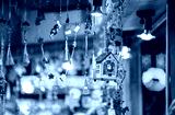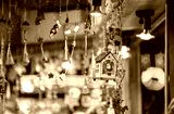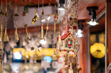 Linz, Austria - December 20, 2024: Wooden Santa house with hanging toys for sale at Christmas market