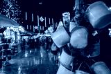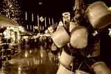 Linz, Austria - December 20, 2024: Plastic jars with cotton candy at Christmas market.