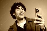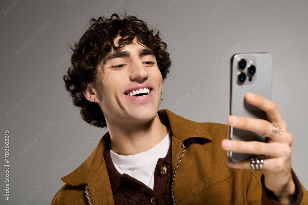Young stylish man enjoying a moment while taking a selfie with a bright smile in a modern setting