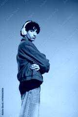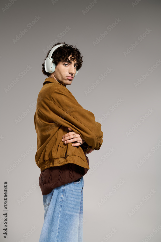Stylish young man with headphones demonstrates modern fashion influence in studio setting