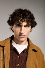 Young man showcasing modern fashion with confidence and style in a studio setting