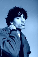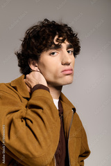 Stylish young man expresses confidence in trendy attire during a modern portrait session