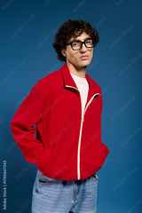 Stylish young man showcases modern fashion against a vibrant blue backdrop in a casual pose