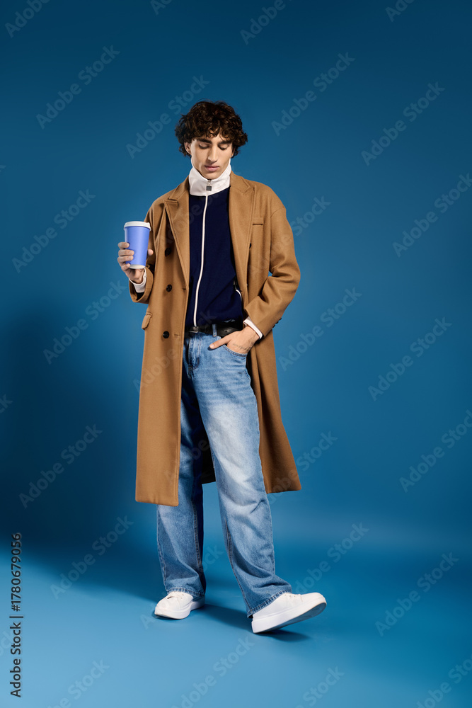 Stylish young man in fashionable attire holds a cup against a vibrant blue backdrop