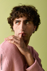 Handsome man showcases stylish flair against a vibrant green background in trendy attire