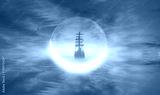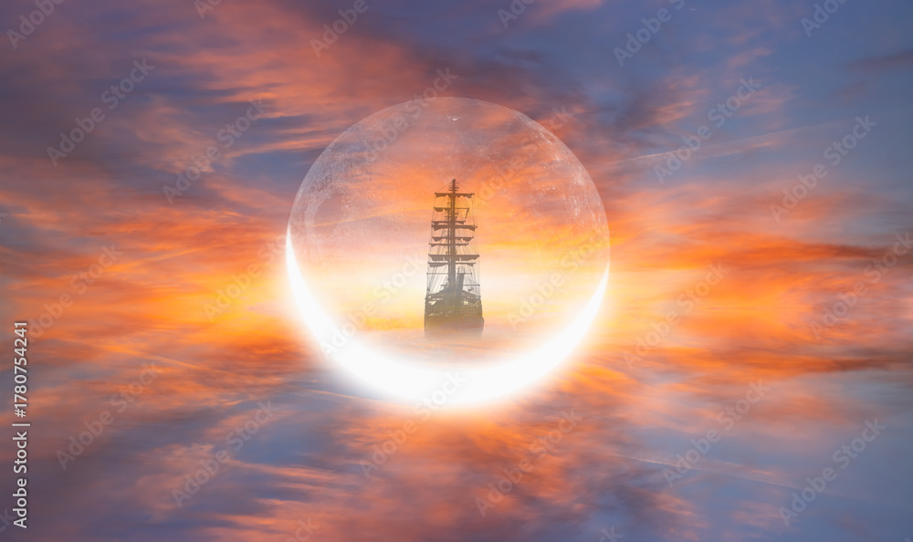 Sailing old ship in stormy sea in the background dramatic sunset and crescent moon
