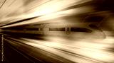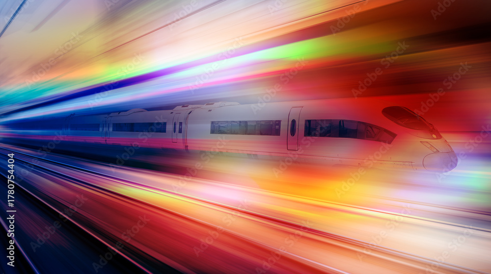 Colorful high speed train runs on rail tracks - The train is going too fast as a result the air pressure is causing too much heat at the front