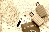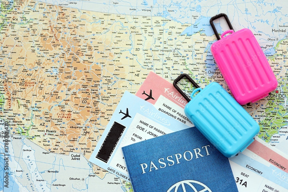 Passport with boarding pass tickets and toy luggage bag on United States map close up