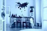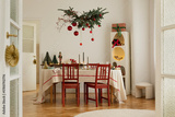 Bright dining room with a festive table setting and red chairs. Christmas decorations with natural greenery and ornaments.