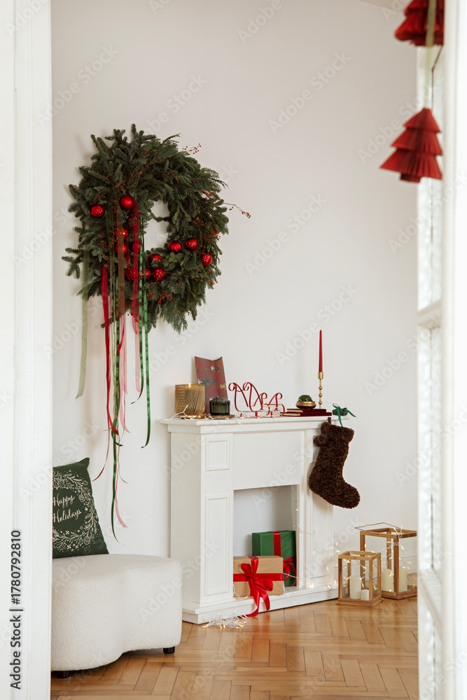 Fireplace decorated with a large green wreath, candles, and wrapped gifts. Traditional Christmas decor in warm tones.