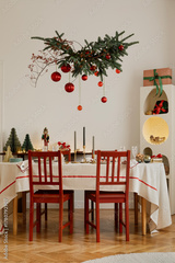 Elegant holiday dining setup with candles, gifts, and red accents. Classic Christmas atmosphere in a modern interior.