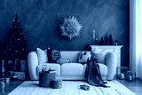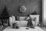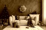 Cozy living room with a Christmas tree, beige sofa, and green wall. Warm festive decor with gifts and soft natural light.
