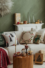 Cozy corner with Christmas decor, candles, and nutcrackers. Green wall and warm lighting evoke a classic festive feel.