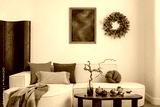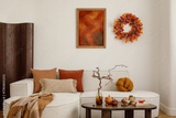 Contemporary living room with orange and brown tones, cozy textiles, and fall-inspired decor. Calm and inviting seasonal styling. Mock up poster.