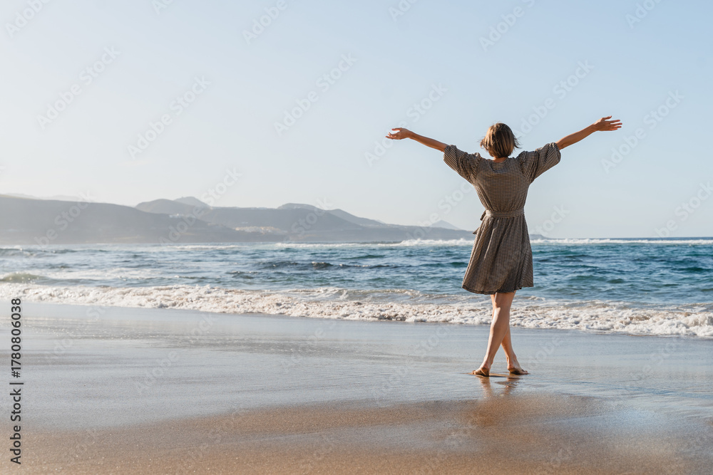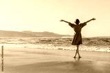 Happy woman runs and jumps by the ocean. Concept freedom and carefree vacation. Beach Holidays. Carefree woman splashing water having fun on the beach. Young girl enjoying fresh air on ocean shore.