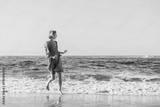 Happy woman runs and jumps by the ocean. Concept freedom and carefree vacation. Beach Holidays. Carefree woman splashing water having fun on the beach. Young girl enjoying fresh air on ocean shore.