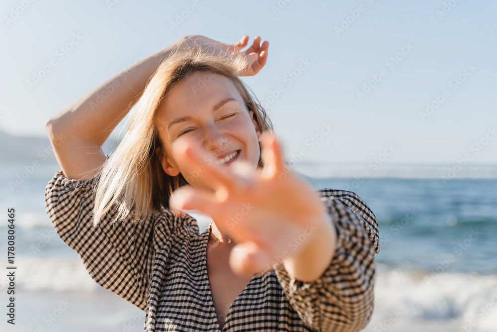 Portrait of happy young woman enjoying fresh air on the beach. Beautiful smiling female having fun on the ocean. Concept freedom and carefree vacation. Beach Holidays.