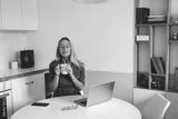 Peaceful woman sits at table with laptop and coffee, eyes closed in enjoyment, reflecting mindfulness, emotional recharge and small rituals during modern remote work life