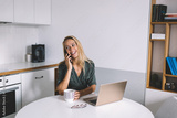 Blond woman laughs while talking on phone, holding coffee cup near laptop, reflecting joy, casual business communication and emotional connection in remote freelance setting