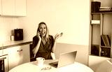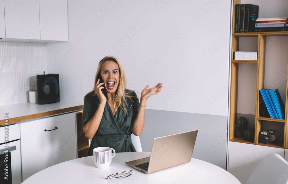 Excited woman on phone call raises hand with joy, expressing emotional high, great news or success in remote freelance work, blending digital achievement with real happiness