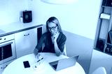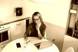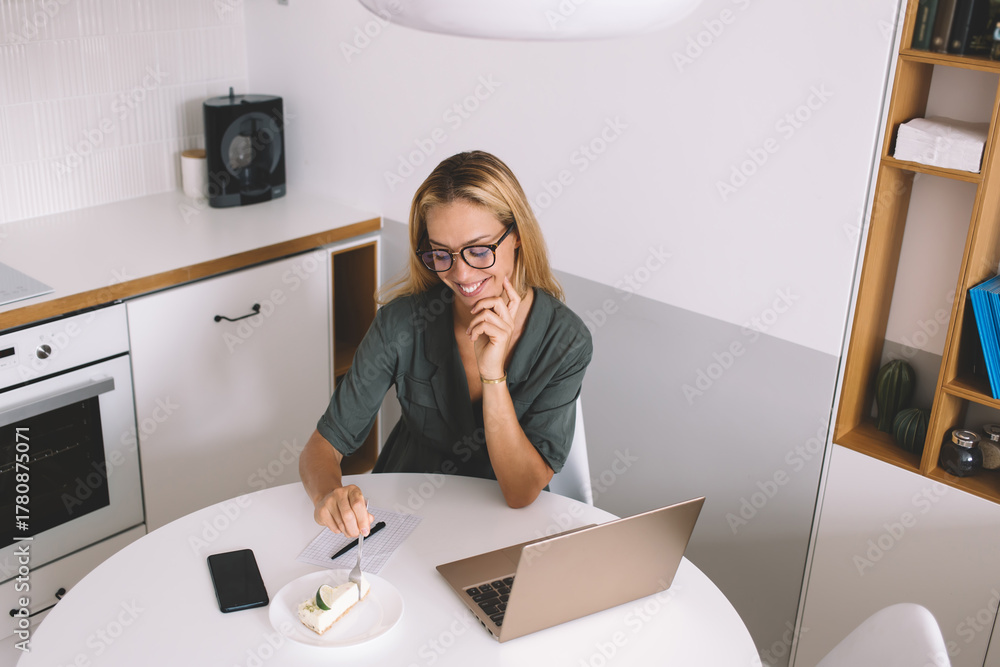 Happy young woman working remotely, enjoying dessert while reading notes beside laptop in casual home setting, reflecting work-life balance in digital lifestyle