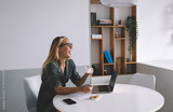 Smiling young female freelancer holding cup, laughing while taking a short coffee break at laptop workspace in relaxed, informal work-from-home setting
