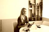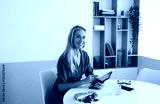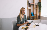 Confident young freelancer smiling toward camera while holding digital tablet during relaxed remote work lunch, combining productivity and lifestyle freedom