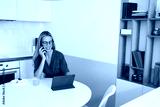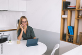 Cheerful young freelancer smiling during phone conversation while working with tablet at white kitchen table, balancing digital productivity with casual comfort
