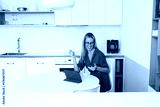 Modern freelancer smiling during remote call, working with tablet at clean kitchen table, using mobile tech to maintain flexible and productive digital workflow
