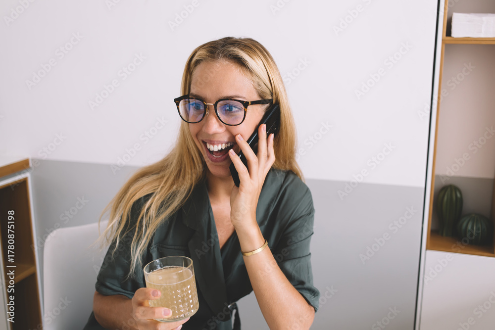 Young woman smiling while balancing dessert and phone, multitasking with mobile and tablet during casual remote work session at home, embodying tech-enabled flexibility