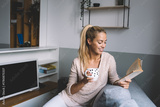 Young freelancer enjoying coffee while reading book, creating a peaceful moment of offline balance within a digitally connected home workspace