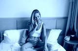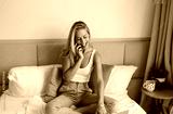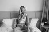 Smiling woman with eyes closed enjoying phone call while resting hand on laptop, illustrating relaxed tech multitasking and emotional ease in digital freelance life