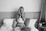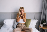 Smiling woman with eyes closed enjoying phone call while resting hand on laptop, illustrating relaxed tech multitasking and emotional ease in digital freelance life