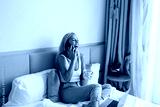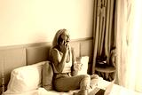 Woman smiling during phone call while holding a mug and seated with laptop, highlighting calm multitasking and remote work comfort in home-based digital life