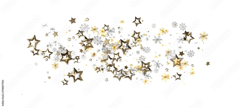 Festive background with gold and silver star and snowflake confetti on a white backdrop. Great for Christmas, New Year, or celebration designs.