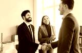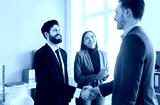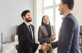 Businesspeople deal interacting, men shaking hands, woman clapping and smiling, happy and celebrating, successful business agreement or partnership finalized, mutual satisfaction, hr meeting