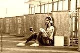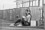 Young smiling woman in a white T-shirt with word "less" listening music and sitting on the pavement