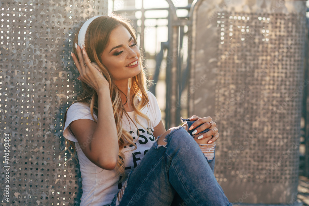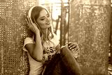 Young smiling woman in a white T-shirt with word "less" listening music and sitting on the pavement